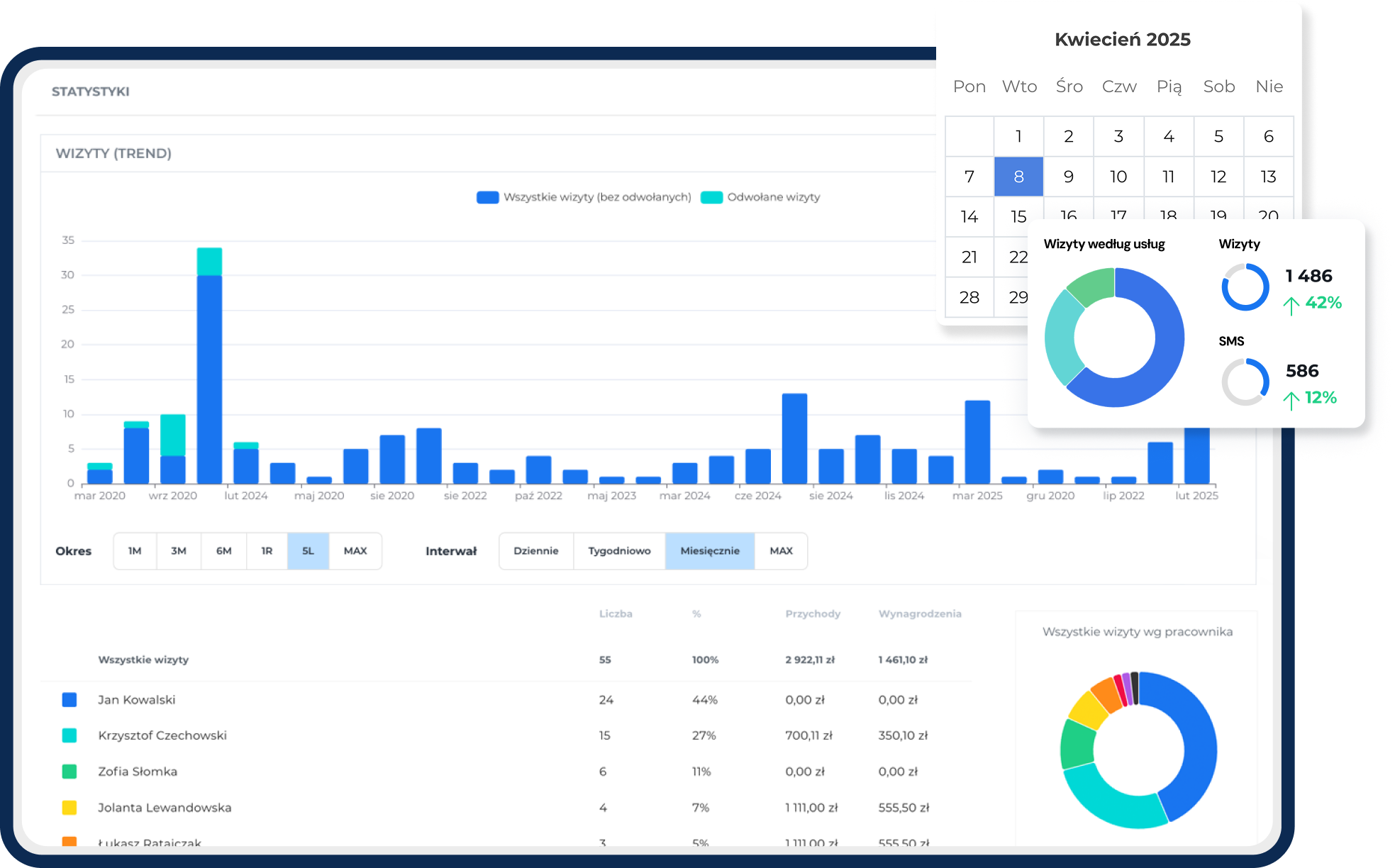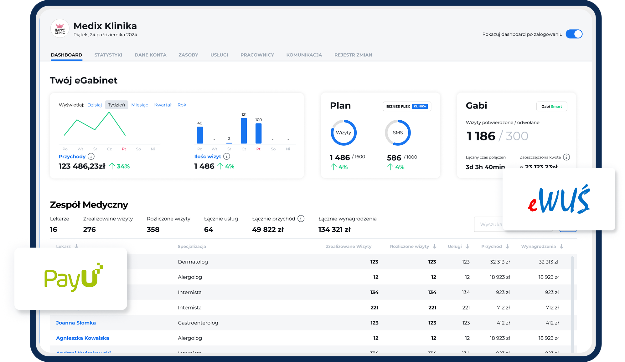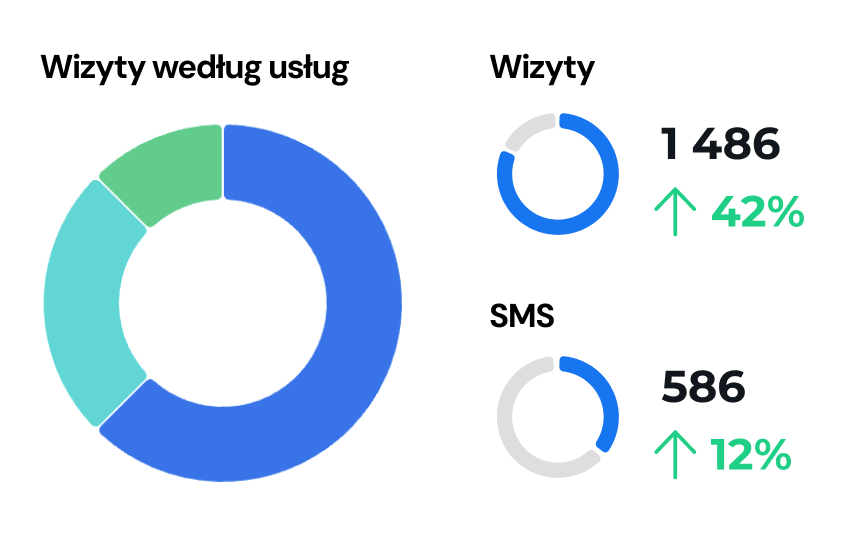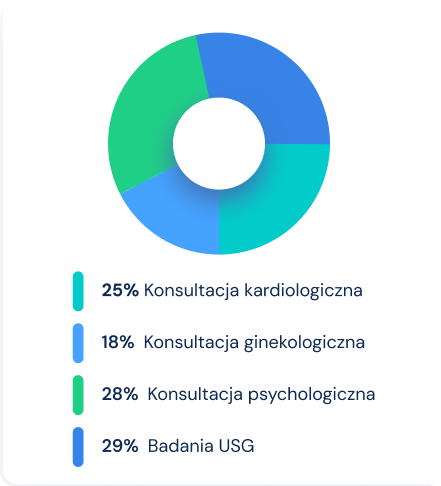 Sprawdzaj dane dotyczące liczby wizyt, naliczaj prowizje dla specjalistów oraz monitoruj opłacalność poszczególnych usług i lekarzy.