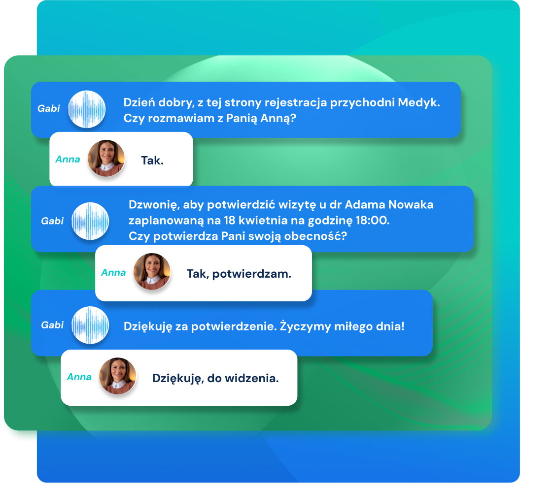 Telefoniczne potwierdzanie wizyt to już przeszłość. Gabi, nasza głosowa asystentka AI, przejmuje obowiązki pracowników recepcji i kontaktuje się telefonicznie z pacjentem w celu potwierdzenia terminu wizyty.